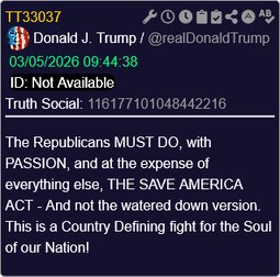 >>24344001 @realDonaldTrump The Republicans MUST DO, with PASSION, and at the expense of everything else, THE SAVE AMERICA ACT - And not the watered down version.