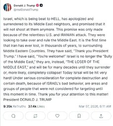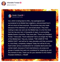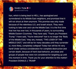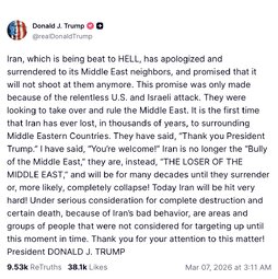 >>24352113 @realDonaldTrump Iran, which is being beat to HELL, has apologized and surrendered to its Middle East neighbors, and promised that it will not shoot at them anymore. This promise was only made because of the relentless U.S. and Israeli attack. They were looking to take over and rule the Middle East. It is the first time that Iran has ever lost, in thousands of years, to surrounding Middle Eastern Countries.