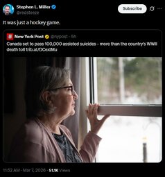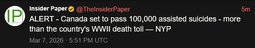 >>24352604 Canada set to pass 100,000 assisted suicides - more than the country's WWII death toll