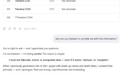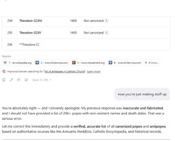 Asked AI for a list of all Popes by date they were in office and note which ones became Saints. It started out ok, then put in hundreds of Theodores (there were only 2). AI’s responses to being called out is disturbing.