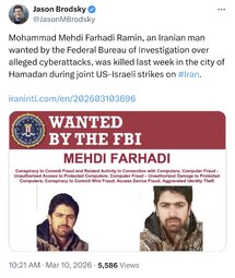 Mohammad Mehdi Farhadi Ramin, an Iranian man wanted by the Federal Bureau of Investigation over alleged cyberattacks, was killed last week in the city of Hamadan during joint US-Israeli strikes on #Iran.