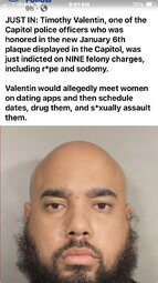 >>24364076, >>24364255 One of the Capitol Police Officers who was honored in the new January 6th plaque in the Capitol was just INDICTED on NINE felony charges including r*pe & sodomy.