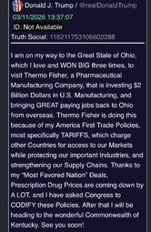 >>24368979 @realDonaldTrump I am on my way to the Great State of Ohio, which I love and WON BIG three times, to visit Thermo Fisher, a Pharmaceutical Manufacturing Company, that is investing $2 Billion Dollars in U.S. Manufacturing