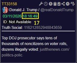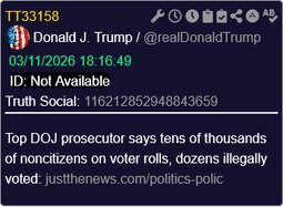 >>24369970, >>24369976 @realDonaldTrump Top DOJ prosecutor says tens of thousands of noncitizens on voter rolls, dozens illegally voted