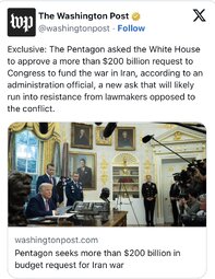 >>24398650 Trump Says ‘War Won’t Be Over This Week’; Pentagon Confirms 200 US Casualties