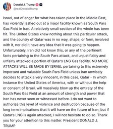 >>24399330 , >>24399396 Trump Announces Israel “Violently Lashed Out” and Hit Gas Fields in Iran, Claims US “KNEW NOTHING” of Attack and “NO MORE ATTACKS WILL BE MADE BY ISRAEL”