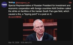 Special Representative of Russian President for investment and economic cooperation with foreign countriesKirill Dmitriev called the strike on facilities of the Iranian South Pars gas field, which caused a fire, a "tipping point" in a post on X: