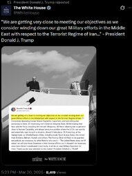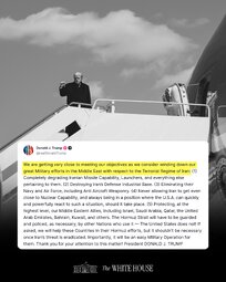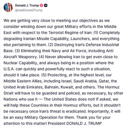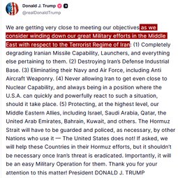 >>24405903, >>24405962, >>24406086 @realDonaldTrump We are getting very close to meeting our objectives as we consider winding down our great Military efforts in the Middle East with respect to the Terrorist Regime of Iran: