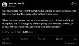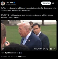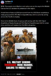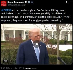 >>24405204 We’re doing extremely well in Iran…They had a navy 2 weeks ago. They have no navy anymore. It's all at the bottom of the sea. 58 ships knocked down in 2 days