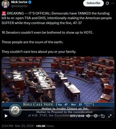 >>24405849, >>24406116 Dems Democrats have TANKED the funding bill to re-open TSA and DHS, 47-37, 16 Senators couldn't even be bothered to show up to VOTE