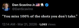 >>24407328 Dan Scavino - “𝐘𝐨𝐮 𝐦𝐢𝐬𝐬 𝟏𝟎𝟎% 𝐨𝐟 𝐭𝐡𝐞 𝐬𝐡𝐨𝐭𝐬 𝐲𝐨𝐮 𝐝𝐨𝐧'𝐭 𝐭𝐚𝐤𝐞.”