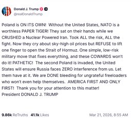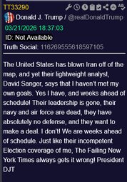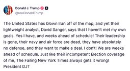 >>24410201 @realDonaldTrump The United States has blown Iran off of the map, and yet their lightweight analyst, David Sanger, says that I haven’t met my own goals. Yes I have, and weeks ahead of schedule! Their leadership is gone, their navy and air force are dead, they have absolutely no defense, and they want to make a deal. I don’t! We are weeks ahead of schedule. Just like their incompetent Election coverage of me, The Failing New York Times always gets it wrong!