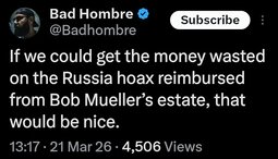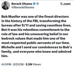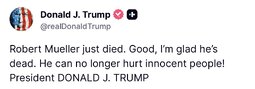 >>24409124 @realDonaldTrump - Robert Mueller just died. Good, I’m glad he’s dead. He can no longer hurt innocent people! President DONALD J. TRUMP