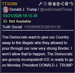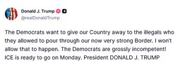 >>24408837, >>24408841 @realDonaldTrump "If the Radical Left Democrats don’t immediately sign an agreement to let our Country, in particular, our Airports, be FREE and SAFE again, I will move our brilliant and patriotic ICE Agents to the Airports where they will do Security like no one has ever seen before…"