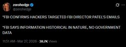 >>24433614, >>24433757 FBI director Kash Patel's personal email address hacked, says DOJ. This comes only a day after Iran-linked Handala hacking group claims it breached the FBI