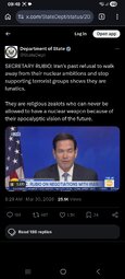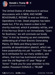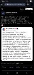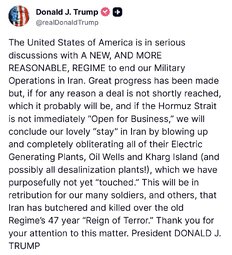 >>24443641 @realDonaldTrump The United States of America is in serious discussions with A NEW, AND MORE REASONABLE, REGIME to end our Military Operations in Iran.