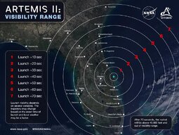 ALT A graphic depicting where skywatchers in the southeastern United States will be able to view the Artemis II launch. Concentric circles spread out from the Space Coast, depicting the visibility range for the first 70 seconds after launch. Credit: NASA