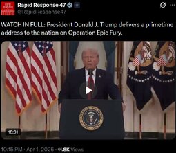 >>24454126 WATCH IN FULL: President Donald J. Trump delivers a primetime address to the nation on Operation Epic Fury.