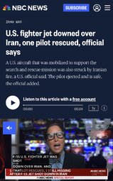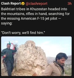 >>24460393, >>24460466, >>24460468, >>24460494, >>24460883 F15E down near Kharg Island, One of the two pilots from the downed F-15 has been rescued by U.S. Special Forces and is ALIVE.