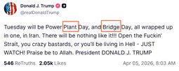 >>24469868 PDJT: Tuesday will be Power Plant Day, and Bridge Day, all wrapped up in one, in Iran.