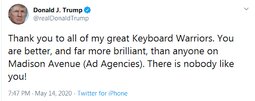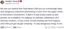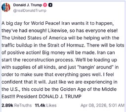 >>24476889 Donald J. Trump / @realDonaldTrump 04/07/2026 19:42:28 OFFICIAL STATEMENT OF IRAN:
