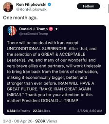 >>24478887 Karoline Leavitt: From the very beginning of Operation Epic Fury, President Trump stated this would be a four to six week military operation to dismantle the military threat posed by the radical Islamic Iranian regime.