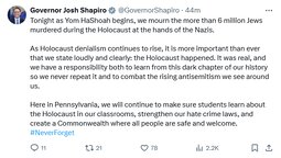 Here in Pennsylvania, we will continue to make sure students learn about the Holocaust in our classrooms, strengthen our hate crime laws, and create a Commonwealth where all people are safe and welcome. #NeverForget