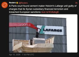 A Paris court found cement maker Holcim's Lafarge unit guilty of charges that its Syrian subsidiary financed terrorism and breached European sanctions