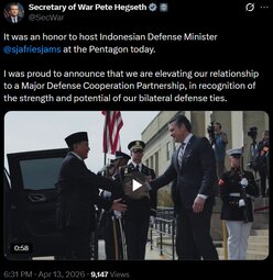 >>24496643 @SecWar: It was an honor to host Indonesian Defense Minister @sjafriesjams at the Pentagon today.