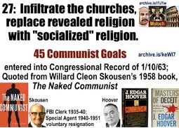 >27. Infiltrate the churches and replace revealed religion with “social” religion.Discredit the Bible…28. Eliminate prayer or any phase of religious expression in the schools on the ground that it violates the principle of “separation of church and state.