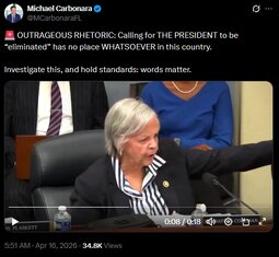 >>24506075 rep. ms watson coleman shown Calling for THE PRESIDENT to be “eliminated”