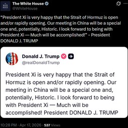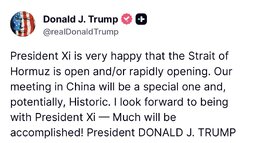 “President Xi is very happy that the Strait of Hormuz is open and/or rapidly opening. Our meeting in China will be a special one and, potentially, Historic. I look forward to being with President Xi — Much will be accomplished!” - President DONALD J. TRUMP