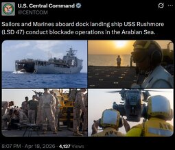 >>24513578 @CENTCOM Since commencement of the blockade, 21 ships have complied with direction from U.S. forces to turn around and return to Iran.