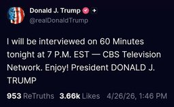 >>24542407, >>24542428 @realDonaldTrump - I will be interviewed on 60 Minutes tonight at 7 P.M. EST — CBS Television Network. Enjoy!