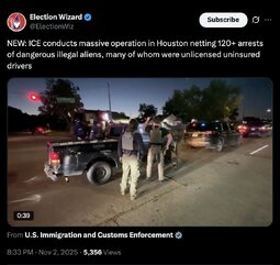 >>243697 EW (TwiX) NEW: ICE conducts massive operation in Houston netting 120+ arrests of dangerous illegal aliens, many of whom were unlicensed uninsured drivers