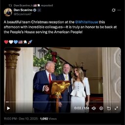 >>246252 DanScavino (TwiX) A beautiful team Christmas reception at the @WhiteHouse this afternoon with incredible colleagues—It is truly an honor to be back at the People’s House serving the American People!