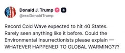 >>249419 DJT (TruSoc) I have been briefed on the Record Cold Wave and Historic Winter Storm that will be hitting much of the United States this weekend. The Trump Administration is coordinating with State and Local Officials. FEMA is fully prepared to respond. Stay Safe and Stay Warm! President DJT