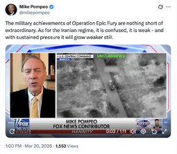 >>256810 KANSAS (TwiX) The military achievements of Operation Epic Fury are nothing short of extraordinary. As for the Iranian regime, it is confused, it is weak - and with sustained pressure it will grow weaker still.