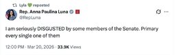 >>256806 RepAnnaPaulinaLuna (TwiX) I am seriously DISGUSTED by some members of the Senate. Primary every single one of them