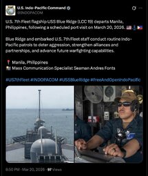 >>256850 USIndoPacComm (TwiX) U.S. 7th Fleet flagship USS Blue Ridge (LCC 19) departs Manila, Philippines, following a scheduled port visit on March 20, 2026. 🇺🇸⚓🇵🇭