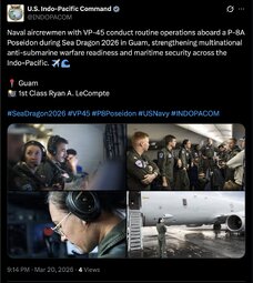 >>256855 USIndoPacComm (TwiX) Naval aircrewmen with VP-45 conduct routine operations aboard a P-8A Poseidon during Sea Dragon 2026 in Guam, strengthening multinational anti-submarine warfare readiness and maritime security across the Indo-Pacific. ✈️🌊