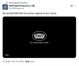 >>256810 KANSAS (TwiX) The military achievements of Operation Epic Fury are nothing short of extraordinary. As for the Iranian regime, it is confused, it is weak - and with sustained pressure it will grow weaker still.