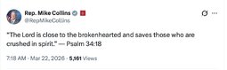 >>257200 RepMikeCollins (TwiX) “The Lord is close to the brokenhearted and saves those who are crushed in spirit.” — Psalm 34:18