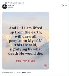 >>257196 GOP (TwiX) And I, if I am lifted up from the earth, will draw all peoples to myself." This He said, signifying by what death He would die.