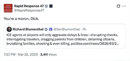 >>257207 StephenMiller (TwiX) Congressional Democrats have kept DHS shut down for more than a month in order to protest and defund the agency tasked with deporting monsters like this. Local and state Democrats prevent authorities from cooperating with that agency. And now another woman is dead.
