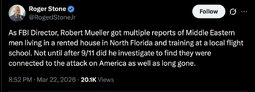 >>257240 RogerStone (TwiX) As FBI Director, Robert Mueller got multiple reports of Middle Eastern men living in a rented house in North Florida and training at a local flight school.