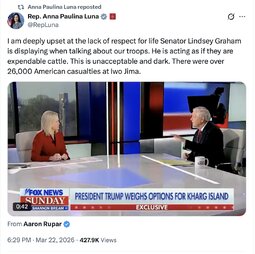 >>257232 RepAnnaPaulinaLuna (TwiX) I am deeply upset at the lack of respect for life Senator Lindsey Graham is displaying when talking about our troops. He is acting as if they are expendable cattle. This is unacceptable and dark. There were over 26,000 American casualties at Iwo Jima.