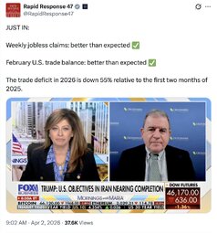 >>258671 RR47 (TwiX) .@USTradeRep Amb. Greer reflects on one year since Liberation Day: "Manufacturing productivity has gone up to the highest level it's ever been. The past two months, we've had record-breaking export numbers for the United States…We've seen the trade deficit go down by 24%."
