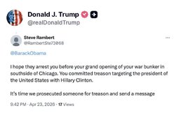 “Obama I hope they arrest you before your grand opening of your war bunker in south side of Chicago.”