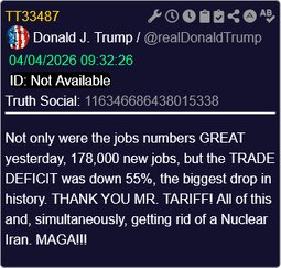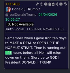 Originally posted at >>>/qresearch/24464126 (041823ZAPR26) Notable: Iran Updates: Trump gives Iran 48 hours to open Hormuz